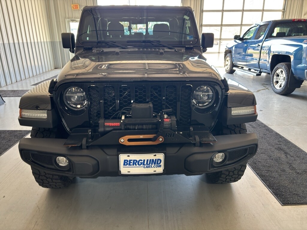 Cold Weather Group: 110 Mph Vehicle Max Speed Calibration; Heated Front Seats; Heated Steering Wheel Convenience Group: Remote Start System; Universal Garage Door Opener Technology Group: 2-Door Passive Entry 8.4 Radio and Premium Audio Group: Google Android Auto; SiriusXM Traffic Plus; USB Host Flip; Uconnect 4C Navigation Radio with 8.4 Display; Integrated Center Stack Radio; Rear View Auto Dim Mirror; For Details LED Headlamp and Fog Lamp Group: Daytime Running Lamps LED Accents; Front LED Fog Lamps; LED Premium Reflector Headlamps MOPAR Spray in Bedliner Black 3-Piece Hard Top Quick Order Package 23W Willys: Speed Sensitive Power Locks; Protection Sill Rails; Leather Wrapped Steering Wheel; 4-Wheel Drive Decal; Black Grille; MOPAR All-Weather Slush Mats; 2-Piece Body Color Fender Flares; Front 1-Touch Down Power Windows; Anti-Spin Differential Rear Axle; Front Heavy Duty Red Accent Shock Absorbers; Security Alarm; Willys; Mold in Color Bumper with Gloss Black; Automatic Headlamps; 17 X 7.5 Black Aluminum Wheels with Gray Pad; Deep Tint Sunscreen Windows; Willys Hood Decal; Rear Heavy Duty Red Accent Shock Absorbers; 97 MPH Vehicle Max Speed Calibration; Power Heated Mirrors; Daytime Running Lamp System; Power Tailgate Lock; Bridgestone Brand Tires; Remote Keyless Entry; Sun Visors with Illuminated Vanity Mirrors